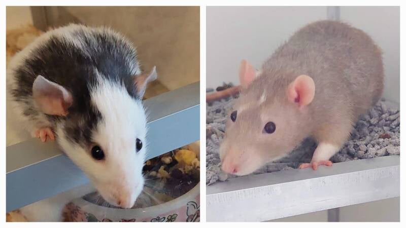 Vogue heeft grote dumbo flappers en leuke vlekken. Daarom heb ik gekozen voor Dart, met gewone oren, want dan worden de flappers iets minder flapperig :-) Dart is een hele grote rat met een klein hartje. Ik heb hem zelf gefokt en hij is heel rustig en lief. Vogue is altijd bezig, de baas in de kooi en met deze combinatie hoop ik op leuke speelse rittens.
